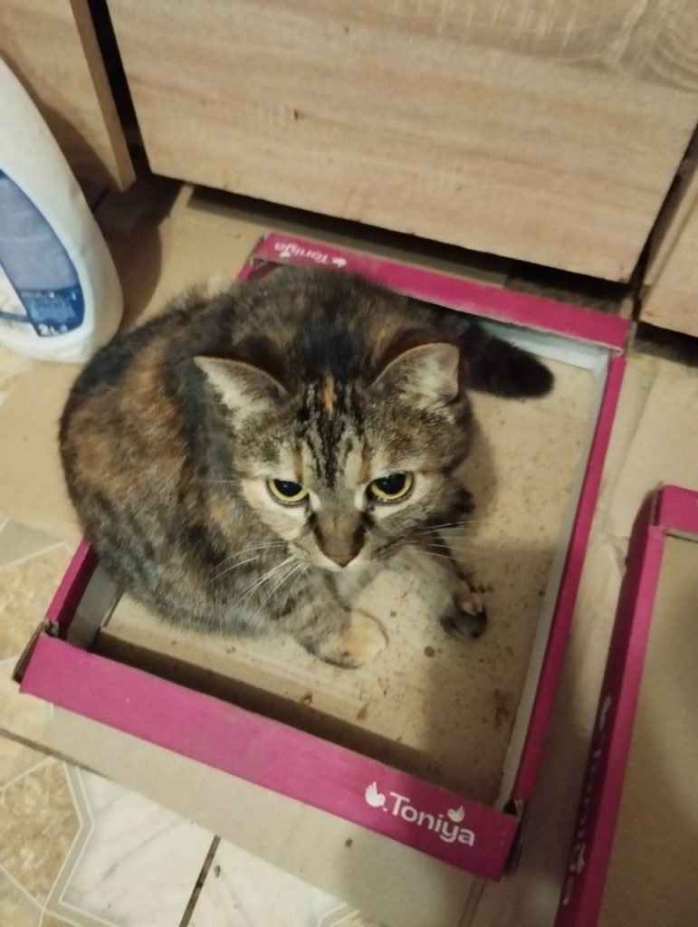 And this beauty in the box whose name is Knopa, was found by … at a bus stop one day after returning from work. She was so weakened that veterinarians barely saved her.