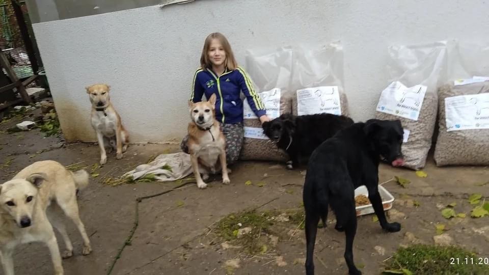 Turning to the last story, the background of its exploration is rather exciting. When looking through the photos in the report, the U-Hearts team found a picture from Greater Good of a girl sitting next to dogs and food and decided to learn the story of the young volunteer. Details were shared with us by her mother, Masha Kabanets.